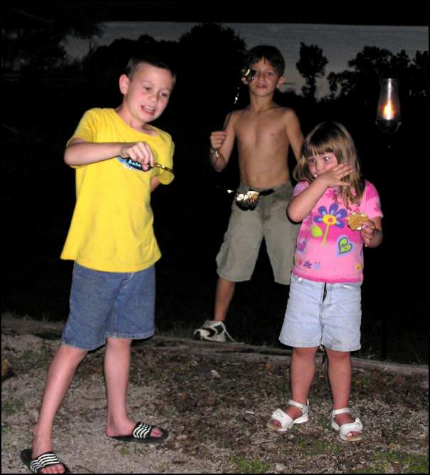Campfire at Papa Don's (Rayon) at Birch Lake - L-R Robert Hedges' grandson, Justin and Kaylin Isbell (children of Don Rayon's daughter Crystal Isbell - her husband Chad Isbell left rear of picture)